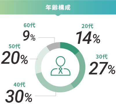 少し男性の方が多めです!ただ、20代は男女がほぼ半々という結果で、女性の入社も増えています。